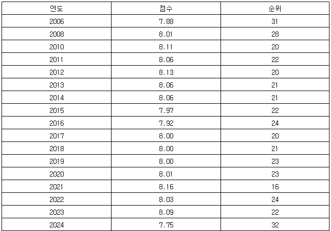 우리나라는 발표 첫해인 2006년에 7.88점을 받아 31위였다. 지난해 점수 7.75점은 종전 최저점인 2006년보다 0.13점, 순위는 32위로 한 계단 낮다.