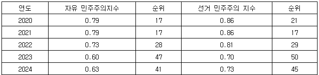 EIU '민주주의 지수' 평가서 역대 최저점, 최저 순위