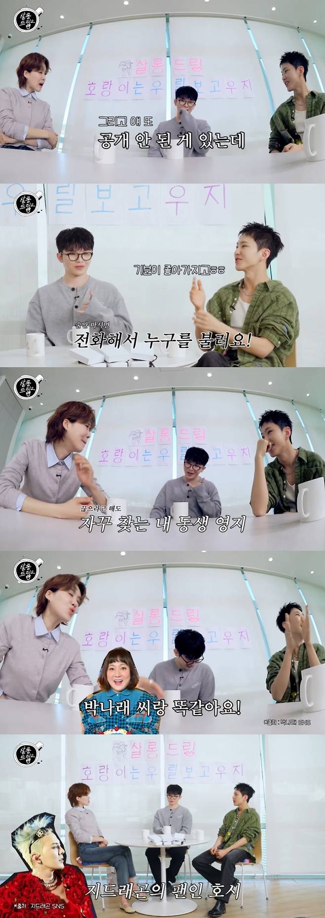 장도연은 "최근에 지용이 형(지드래곤)에 관한 애정을 많이 드러내던데 술 먹고 연락 드린 적은 없냐"라며 묻자, 호시는 "그런적은 없다. 사실 제가 내향형이다. 형들한테는 연락을 잘 못한다. 지용이 형한테는 전화만 두 번 해봤다"라고 전했다.