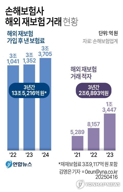 (서울=연합뉴스) 김영은 기자 = 16일 손해보험업계에 따르면 최근 3년간 해외로 빠져나간 재보험료가 14조원에 육박하는 것으로 집계됐다.