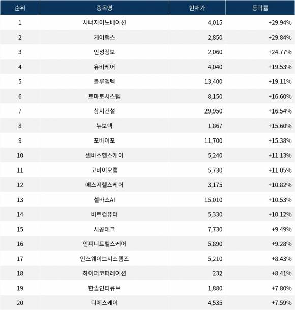 6위 토마토시스템(393210)은 현재가 8,150원으로 16.60% 상승 중이다. 7위 상지건설(042940)은 현재가 29,950원으로 16.54% 상승 중이다. 8위 뉴보텍(060260)은 현재가 1,867원으로 15.60% 상승 중이다. 9위 포바이포(389140)는 현재가 11,700원으로 15.38% 상승 중이다. 10위 셀바스헬스케어(208370)는 현재가 5,240원으로 11.13% 상승 중이다.
