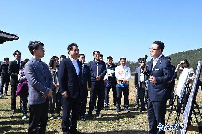 ▲ 구복규 화순군수가 김완섭 환경부장관과 김영록 전남도지사에게 적벽 명소화 사업의 요지와 상수원 보호구역 주민들의 불편 등에 대해 브리핑하고 있다. |