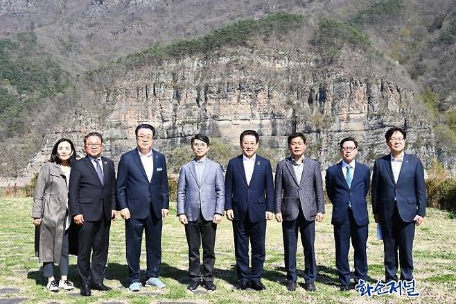 ▲ 김완섭 환경부장관, 김영록 전남도지사, 구복규 화순군수가 적벽 일원에서 면담을 가진 가운데, 김효정 환경부 물이용정책관, 김영우 영산강청장 등 현장 참석자들과 함께 화순적벽 앞에서 기념 촬영하고 있다. |