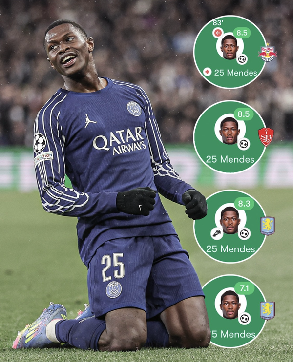 매체는 "멘데스가 빌라를 상대로 결승골을 넣으며 PSG를 준결승에 올렸다. 이번 시즌 멘데스는 수비수 중 최다 득점(4골), 리버풀과의 1, 2차전에서 살라의 공격 포인트 적립을 봉쇄, 빌라와의 1, 2차전에서 2경기 연속 득점을 기록했다. 22세 레프트백 멘데스는 현재 월드클래스 수준의 활약을 펼치고 있다"며 찬사를 보냈다.
