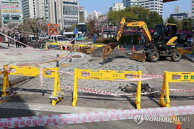 (인천=연합뉴스) 임순석 기자 = 땅 꺼짐 현상이 발생한 인천 부평구 부평역 횡단보도에서 16일 관계자들이 복구공사를 진행하고 있다.