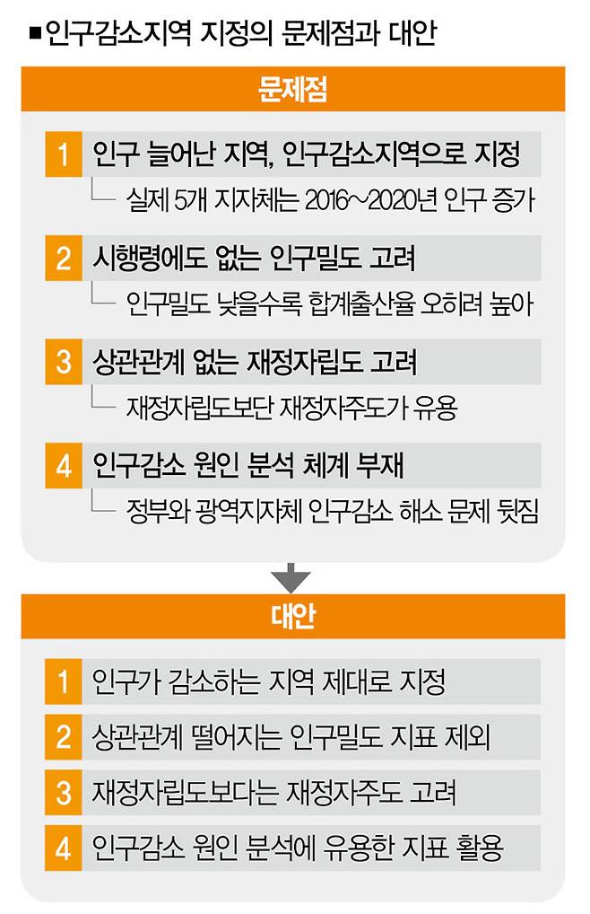 셋째, 인구감소지역을 지정할 때 시행령에 따라 재정여건도 고려하는데, 그 방법이 적절하지 않다는 점이다. 보고서에 따르면 인구와 재정자립도는 정비례하는 경향을 보이는데, 재정자립도를 기준으로 삼으면 '실제 인구가 감소하는 지역'보다 '인구가 적은 지역'이 인구감소지역으로 지정될 가능성이 높다.