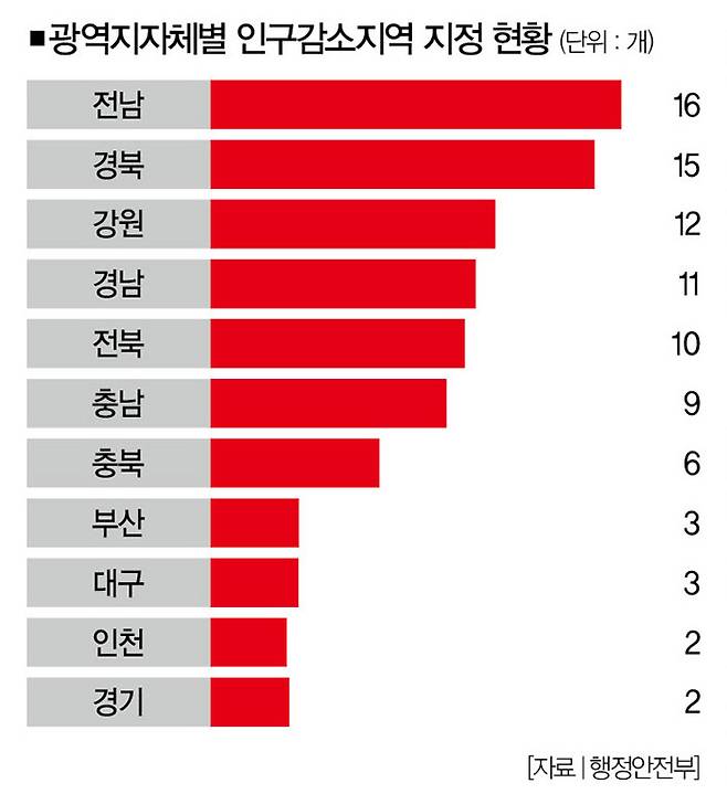 이처럼 요즘 지방자치단체장들의 최대 과제는 인구 유출을 막는 것이라 해도 과언이 아니다. 정부도 마찬가지다. 행정안전부는 2021년 10월부터 인구감소지역을 지정하고 있다. '지방자치분권 및 지역균형발전에 관한 특별법(지방분권균형발전법)'과 그 시행령에 따른 조치다. 이들 지역을 행정적ㆍ재정적으로 지원해 인구감소를 막겠다는 취지다.