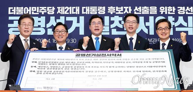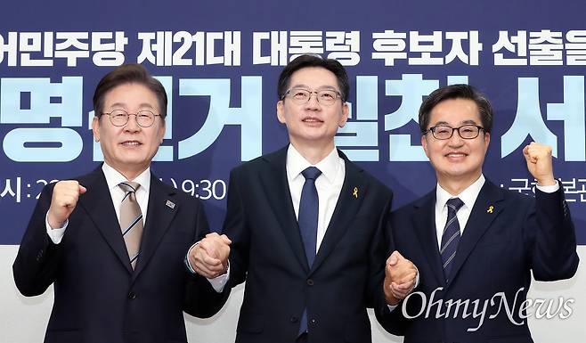 더불어민주당 대선후보 경선 주자인 이재명 전 대표(왼쪽부터), 김경수 전 경남지사, 김동연 경기지사가 16일 서울 여의도 국회에서 열린 공명선거 실천 서약식에서 서약문에 서명한 뒤 선전을 다짐하고 있다.