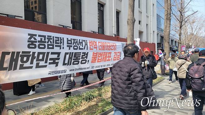 | ▲ 대통령 탄핵을 반대하는 고대인들 주최로 지난 2월 21일 오후 서울 성북구 고려대 정문 앞에서 탄핵반대 시국선언이 열리는 동안 윤석열 대통령 지지자들이 교문에 매달린 채 윤석열 대통령 탄핵의 배후에는 중국이 있다며 시위를 하고 있다. |