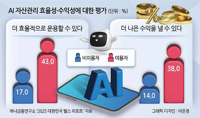 16일 하나은행 하나금융연구소가 발간한 ‘2025 대한민국 웰스 리포트’에 따르면 금융자산 10억원 이상 보유한 부자 884명을 대상으로 설문한 결과 6.9%가 현재 AI 자산관리·투자관리 서비스를 이용하고 있다고 답했다. 과거 이용했으나 현재 이용하고 있지 않은 응답자 9.4%를 더하면 총 16.3%가 AI 자산관리·투자관리 서비스를 경험한 것으로 파악된다.