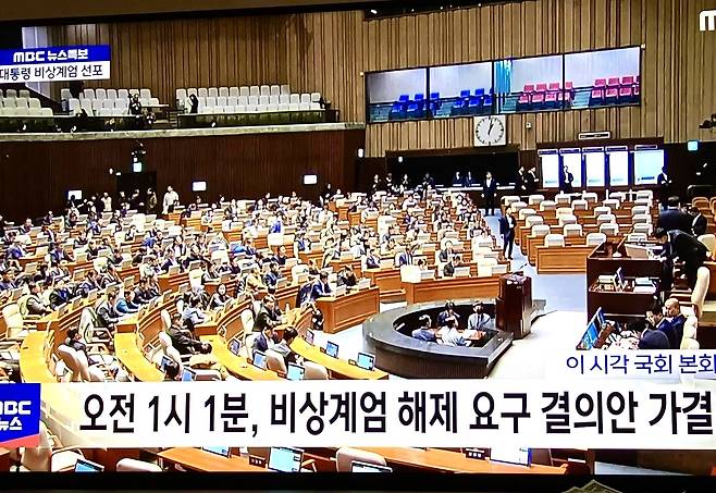 | ▲ 윤 대통령의 비상계엄선포에 국회는 2024년 12월 4일 새벽 비상계엄 해제 요구 결의안을 가결시키면서 6시간만에 비상계엄이 해제됐다. |