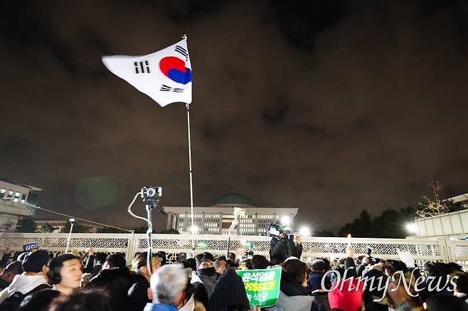 | ▲ 윤석열 대통령이 2024년 12월 3일 밤 기습적으로 비상계엄을 선포한 가운데, 계엄군이 점령을 시도한 국회앞에서 시민들이 집결해 계엄해제를 요구하고 있다. |