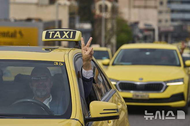 [아테네=AP/뉴시스] 15일(현지 시간) 그리스 아테네 도심에 차를 세워 놓은 파업 참가 택시 기사가 V를 그리고 있다. 이날 아테네에서 택시 업계 규제에 항의하는 택시 운전자들의 파업이 하루 동안 열렸다. 2025.04.16.