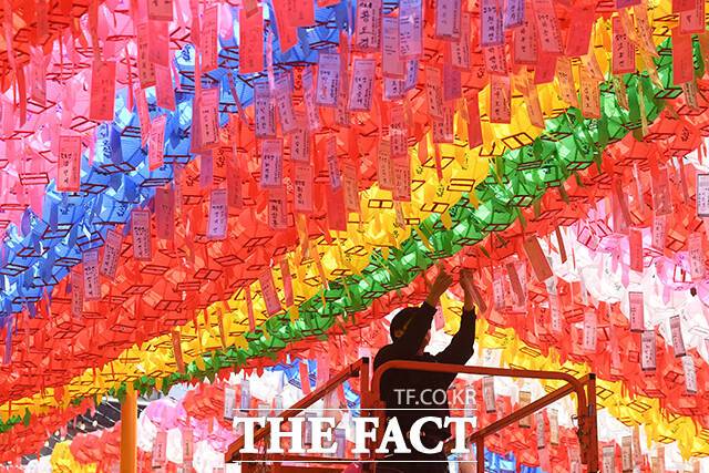 [더팩트ㅣ서예원 기자] 불기 2569년 부처님오신날을 앞둔 16일 오전 서울 종로구 조계사에서 관계자가 연등에 등표를 달고 있다.