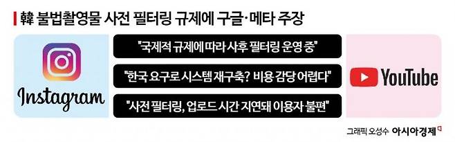 앞서 정부는 전기통신사업법 시행령을 개정해 플랫폼 기업들이 불법촬영물을 사전 차단해 인터넷상에 올리지 않아야 한다고 규정했는데, 유튜브와 인스타그램을 소유한 빅테크들이 반기를 든 것이다.