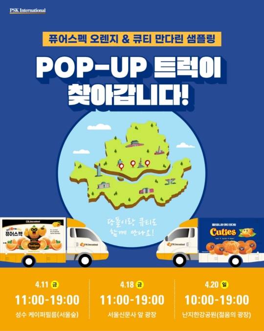 생과일 전문 수입사 피에스케이인터내셔널(PSK International Inc.)은 퓨어스펙 오렌지 & 큐티 만다린 샘플링 트럭 팝업 이벤트로 서울 시내 곳곳을 찾아간다고 밝혔다.