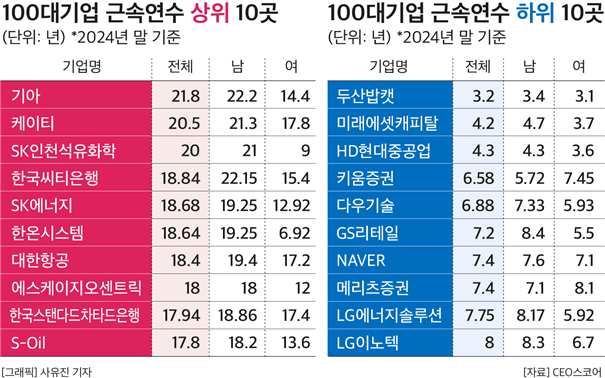 반면 현대자동차는 같은 기간 18.80년에서 15.80년으로 근속연수가 3.00년 줄어 감소 폭이 가장 컸다. SK에너지(2.31년↓), 고려아연(2.17년↓), 한화생명(1.70년↓), SK지오센트릭(1.63년↓), KG케미칼(1.30년↓), KT(1.10년↓) 등도 근속연수가 줄었다.