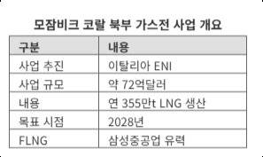 16일 업계에 따르면 모잠비크 정부는 최근 코랄 북부 가스전에 대한 이탈리아 에너지 기업 ENI의 개발 계획을 승인했다. 투자 규모는 약 72억 달러(약 10조5000억원)다. 삼성중공업은 이탈리아 ENI가 발주한 모잠비크 FLNG 건조 작업에 이미 착수한 상태로, 사실상 계약 체결만 남은 것으로 알려졌다.