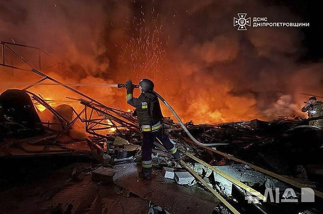 [카미얀스케=AP/뉴시스] 16일(현지 시간) 우크라이나 드니프로페트로우스크주 카미얀스케에서 소방관들이 러시아의 드론 공격으로 발생한 화재를 진압하고 있다. 2025.04.16.