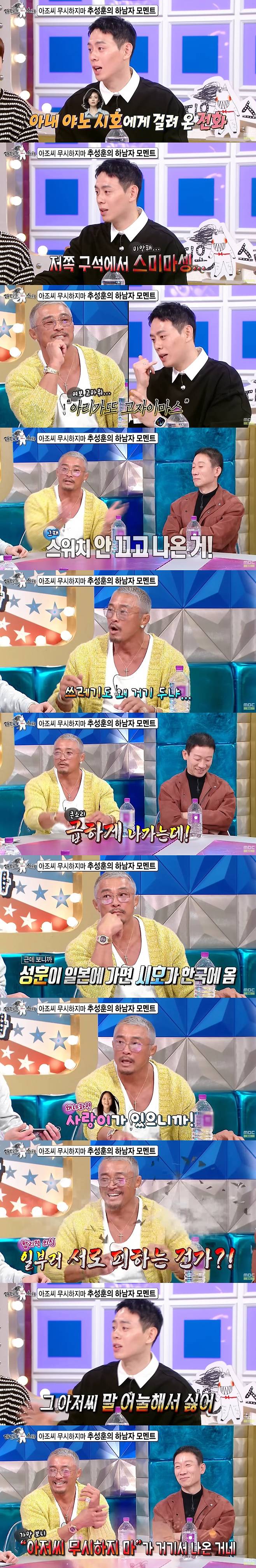 추성훈은 '아내가 어떤 걸로 잔소리를 하냐'는 질문에 "일본에서 한국으로 올 때 스위치 안 끄고 나온 거, 쓰레기 잘 못 둔 것 등을 이야기 한다"며 "국제전화까지 와서, 급하게 나가는 데 그럴 수도 있지 않냐"며 오히려 큰소리를 쳐 웃음을 자아냈다.