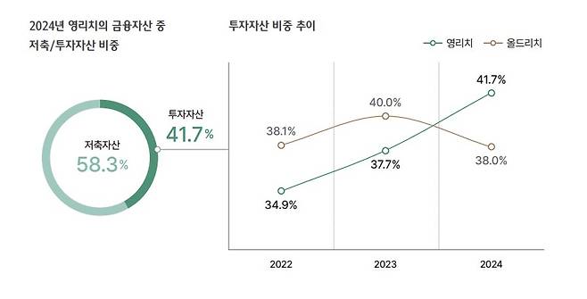 하나금융연구소는 16일 이 같은 내용이 담긴 '2025 대한민국 웰스리포트'를 발간했다. 리포트는 3010명(부자 884명·대중부유층 1545명·일반대중 581명)을 대상으로 온라인 설문조사와 프라이빗 뱅커(PB) 인터뷰를 기반으로 작성됐다. 하나금융연구소에 따르면 최근 3년간 영리치의 자산규모는 평균 60억원으로 이중 금융자산은 절반인 30억원 수준이었다. 같은 기간 영리치의 투자자산 비중(41.7%)이 빠르게 증가하면서 지난해부터 올드리치(38%)보다 투자자산 비중이 더 높아졌다.