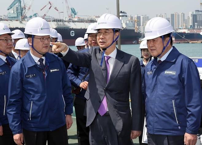 한덕수 대통령 권한대행 국무총리가 16일 HD현대중공업 울산 조선소에서 HD현대중공업 권오갑 회장(오른쪽) 등과 정조대왕급 2번함 '다산정약용함' 설명을 듣고 있다 [사진:연합뉴스]