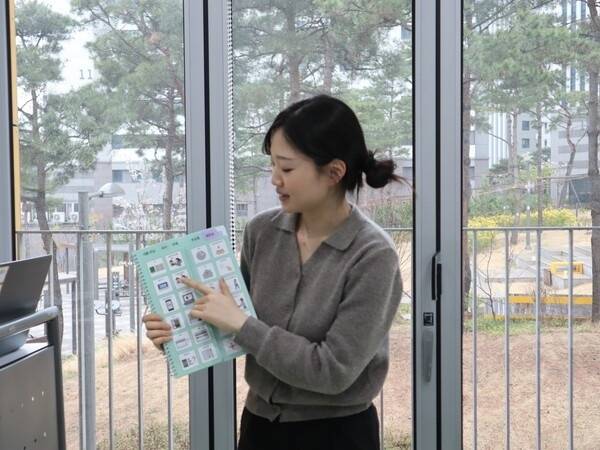 | ▲ 장진영 사서가 AAC(보완대체 의사소통) 존에서 사용되는 도구를 설명하고 있다. AAC란 의사소통에 어려움이 있는 사람(장애인, 느린학습자, 고령자, 외국인 등)이 표정, 몸짓, 그림 등의 형태로 의사소통하는 방법을 말한다. |