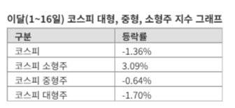16일 한국거래소에 따르면 이달 들어 코스피 소형주 지수는 3.09% 상승했다. 같은 기간 코스피 중형주 지수(-0.64%)와 코스피 대형주 지수(-1.70%)는 모두 부진한 수익률을 기록한 반면 소형주만 오름세를 탔다. 이 기간 코스피 전체 지수(-1.36%)와 비교해도 소형주의 선전이 돋보인다.