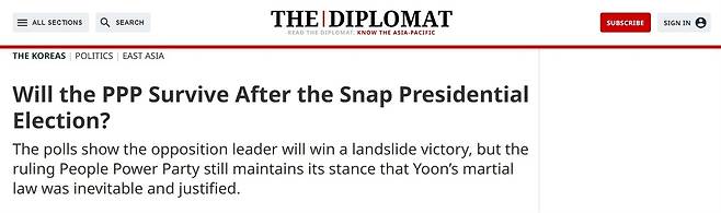 | ▲ 15일(현지시간) 미국 외교전문지 <디플로매트>는 "조기 대선 이후에도 국민의힘은 살아남을 수 있을까?(Will the PPP Survive After the Snap Presidential Election?)"라는 제목의 기사를 보도했다. |