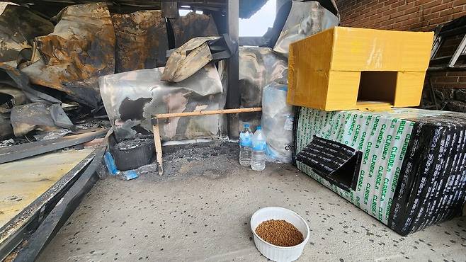 대규모 산불로 다 타버린 집 근처에서 지내는 삼색 고양이와 검은 고양이를 위한 집이었습니다.