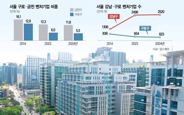 16일 상업용 부동산 서비스 기업 알스퀘어에 따르면 2024년 기준 서울 구로구에 입주한 벤처기업 수는 623개로 집계됐다. 이는 2021년 791개에 비해 20% 이상 줄어든 수치다. 구로와 비슷하게 지식산업센터가 밀집한 가산디지털단지를 보유한 금천구 역시 사정은 비슷했다. 이곳에 입주한 기업은 1326개로 3년 전에 비해 70개가 줄었다.