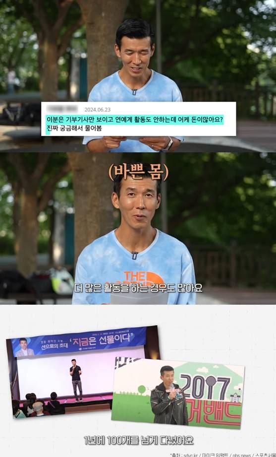 개인적으로도 60억 이상의 기부를 한 션은 기부금 출처에 대해 "강연을 1년에 100개 넘게 다녔다. 하루에 다섯 번을 한 적도 있다. 엠버서더 하는 건 다섯 가지다"라며 방송에 나오지 않고 기부를 할 수 있었던 상황에 대해 밝히기도 했다.