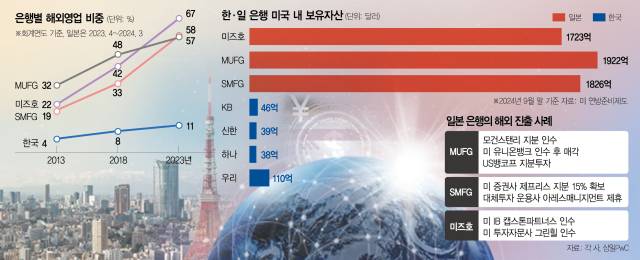 개별 은행 간 격차도 크다. 일본은 MUFG가 1922억 달러에 달하고 SMFG가 1826억 달러, 미즈호가 1723억 달러다. 반면 한국은 가장 자산이 많은 우리금융조차 110억 달러에 불과하다. KB금융(46억 달러), 신한(39억 달러), 하나(38억 달러) 등 일본 은행과 많게는 50배 가까이 차이가 벌어진다. 삼일PwC는 “일본은 글로벌 금융시장의 중심인 미국에 진출함으로써 선진금융 시장에 진입하고 선진 금융기법을 체득화했다”며 “이는 한국 기업 진출이 집중된 동남아에 투자가 집중되는 국내 금융사의 해외 진출 전략과 큰 차이”라고 지적했다.