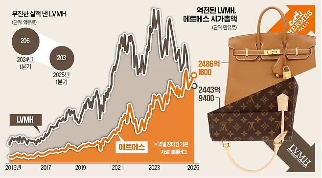 ‘명품제국’으로 군림해 온 루이비통모에헤네시(LVMH)가 처음으로 명품기업 시가총액 1위 왕좌를 에르메스에 내줬다. 중국 경기 침체에 미국 관세 부담까지 겹쳐 수익성이 악화할 것이란 예상이 나오고 있어서다. 거대 명품 그룹을 만든 LVMH의 전략이 불황기에 독이 됐다는 분석이 나온다.