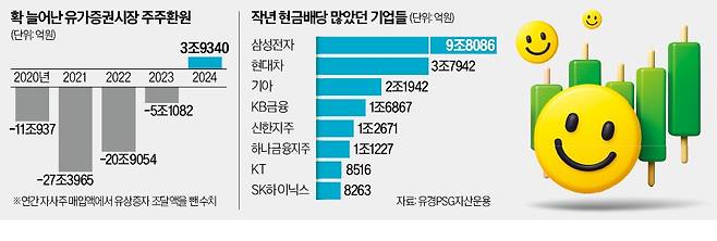 16일 유경PSG자산운용에 따르면 작년 유가증권시장 내 전체 자사주 매입액(직접 및 신탁 합계)에서 유상증자 총액을 뺀 액수는 3조9340억원으로 집계됐다.