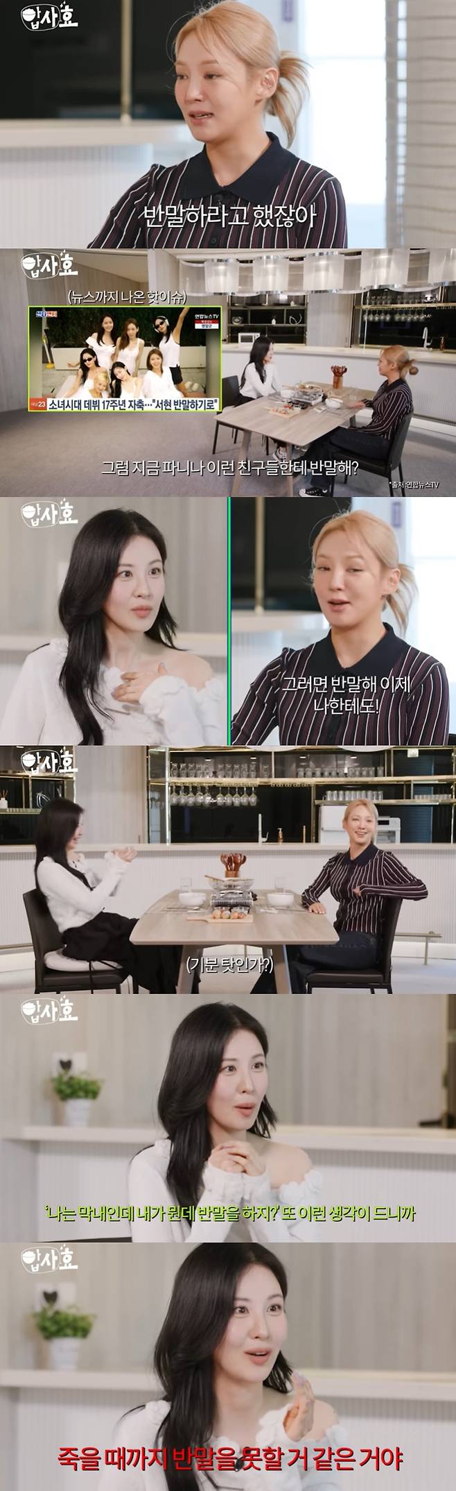 이어 "지금 아니면 죽을 때까지 반말을 못 할 것 같더라"라며 어느덧 소녀시대 데뷔 19년 차에서야 멤버들에게 말을 놓기 시작한 듯한 모습을 보였다.
