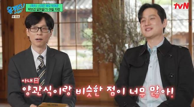 이날 박해준의 두 아들이 ‘유 퀴즈’ 촬영을 함께한 가운데 박해준은 “아이들을 보니 넌물이 난다. ‘유 퀴즈’에 내가 나오게 돼 감격스럽다. 분위기도 너무 좋고 정신도 없다”면서 벅찬 소감을 나타냈다.