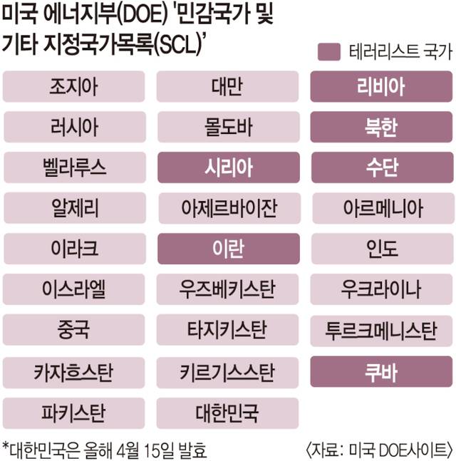 미국 에너지부(DOE)가 지난 15일(현지시간)부터 한국을 '민감국가 관리대상국(Sensitive Country List)'에 포함시켰다.