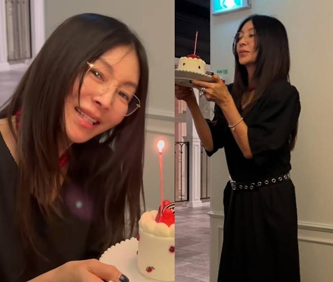 공개된 사진 속 황신혜는 올 블랙의 롱 원피스를 입은 채 우아한 분위기를 자랑하고 있으며, 양손으로 케이크를 들고 있다. 그는 얇은 테의 안경과 블랙 네일로 포인트를 더했다.