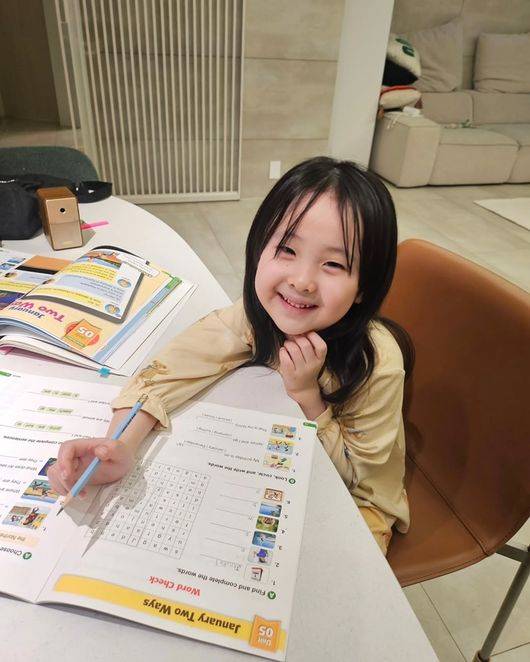 사진에는 숙제를 하고 있는 송이의 모습이 담겼다. 의젓하게 책상에 앉아 숙제를 하면서 엄마가 사진을 찍자 환하게 미소를 짓는 모습이 인상적이다.
