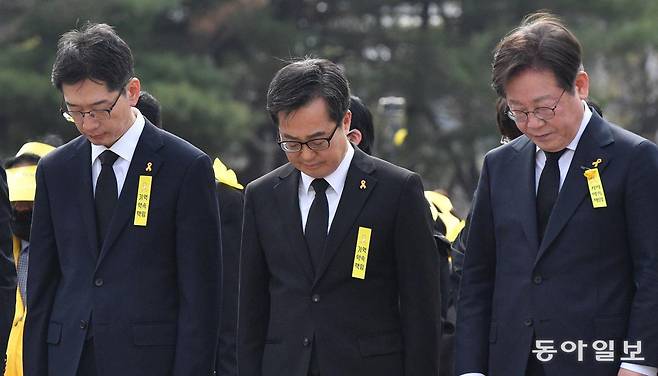 | 세월호 추도식 찾은 민주당 세 후보… 국힘 후보들은 불참 더불어민주당 대선 경선에 출마한 김경수 전 경남도지사, 김동연 경기도지사, 이재명 전 민주당 대표(왼쪽부터)가 16일 경기 안산시 화랑유원지에서 열린 세월호 참사 11주기 기억식에 참석해 묵념하고 있다. 이날 기억식에 국민의힘에선 권영세 비상대책위원장만 참석했으며, 국민의힘 대선 후보들은 불참했다. 안산=장승윤 기자 tomato99@donga.com |