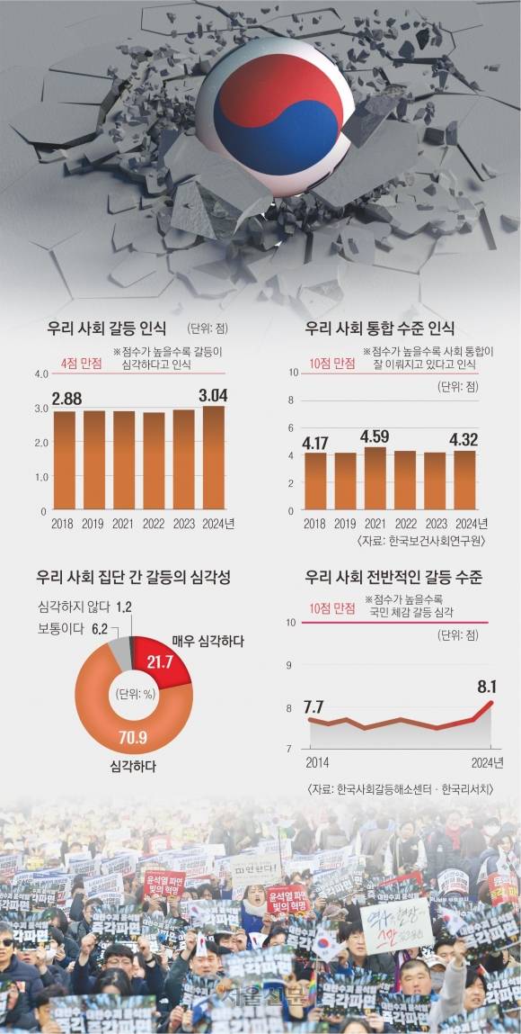 깊어진 우리 사회 갈등의 골은 수치로도 드러난다. 한국보건사회연구원이 지난해 6~8월 전국의 19~75세 국민 3011명을 대상으로 실시한 ‘2024 사회통합실태조사’에 따르면 우리 사회의 갈등 정도는 지난해 4점 만점에 3.04점으로 나타났다. 해당 조사에 사회 갈등에 관한 문항이 포함된 2018년 이래 가장 높은 수치다.