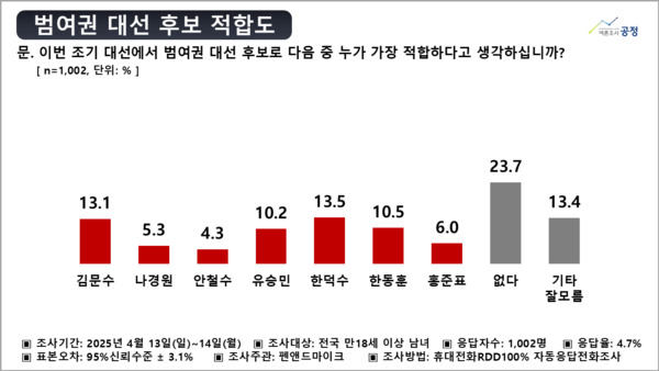 16일 정치권에 따르면 여론조사공정(주)이 펜앤마이크의 의뢰로 13~14일 이틀간 전국 만 18세 이상 남녀 1200명을 대상으로 범여권 대선후보 적합도 조사를 진행한 결과 한 권대행은 13.5%의 지지를 얻은 것으로 나타났다. 김문수 전 고용노동부 장관(13.1%)을 오차범위 내에서 앞섰다.