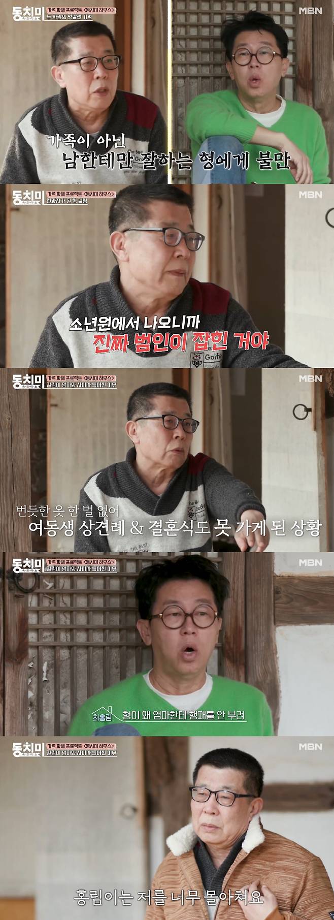 형은 "엄마의 말이 아직도 생각난다. 그래서 나는 아무 죄도 없이 1년 개월을 소년원에 살았다. 소년원에서 나오니까 진짜 범인이 잡혔더라"며 "엄마가 그렇게 날 미워해서 전과가 생겼다. 그렇게 날 미워하던 찰나에 네가 태어났으니까 널 더 금이야 옥이야 한 거다. 내가 나이 드니까 엄마를 이해하지만 그 당시에는 원망 많이 했다"고 털어놨다. 최홍림은 "가족들에게 어렴풋이는 들었지만 자세히는 못 들었다"며 처음 알게 된 사실에 충격받은 모습을 보였다.