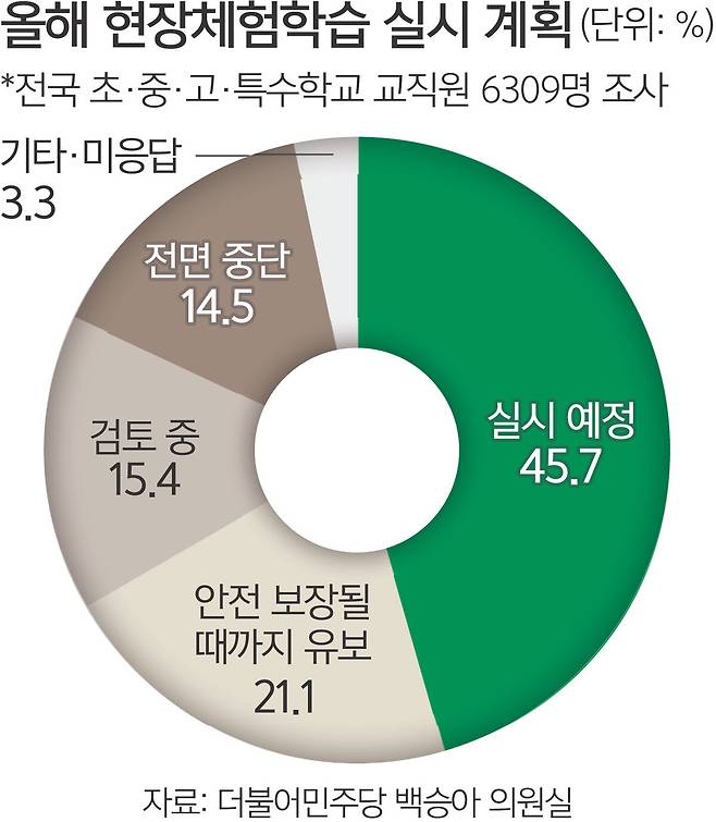 이런 안전에 대한 우려 여파로 ‘올해 현장체험학습을 실시한다’는 응답은 45.7%(2867명)에 그쳤다. 21.1%는 ‘법적·제도적 안전이 보장될 때까지 유보한다’, 15.4%는 ‘검토 중’이라고 했고, ‘전면 중단한다’는 응답은 14.5%였다. 학교에서 소풍이 사라지는 추세인 것이다.