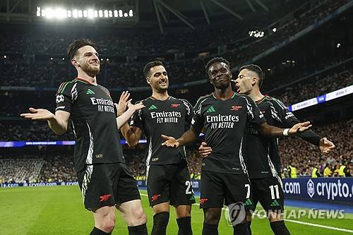 epa12035788 Arsenal's Bukayo Saka (2-R) celebrates with teammates after scoring the 0-1 goal during the UEFA Champions League quarter final 2nd leg soccer match between Real Madrid and Arsenal FC, in Madrid, Spain, 16 April 2025. EPA/Mariscal