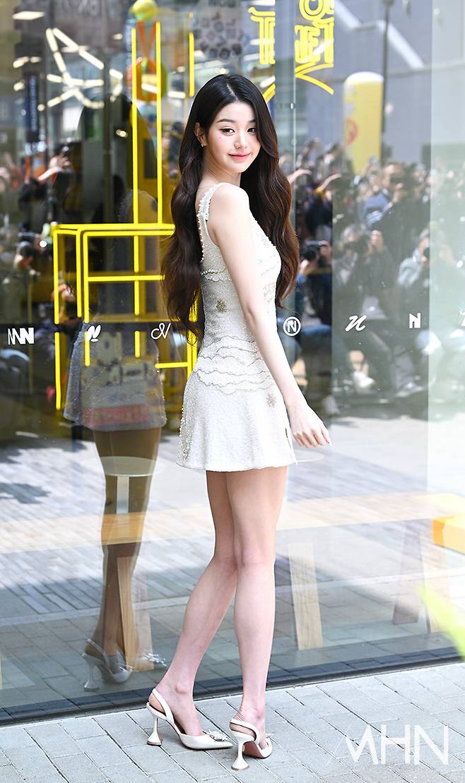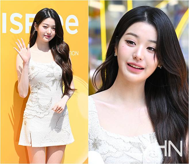 이날 장원영은 드레스 전면에 태양과 달, 구름 모양의 비즈 장식이 포인트 된 화사한 화이트 미니 드레스를 입고 등장했다. 여기에 구두 앞부분에 달린 꽃 모양이 돋보이는 화이트 힐에 심플한 이어링으로 우아하고 세련된 룩을 완성시켰다.