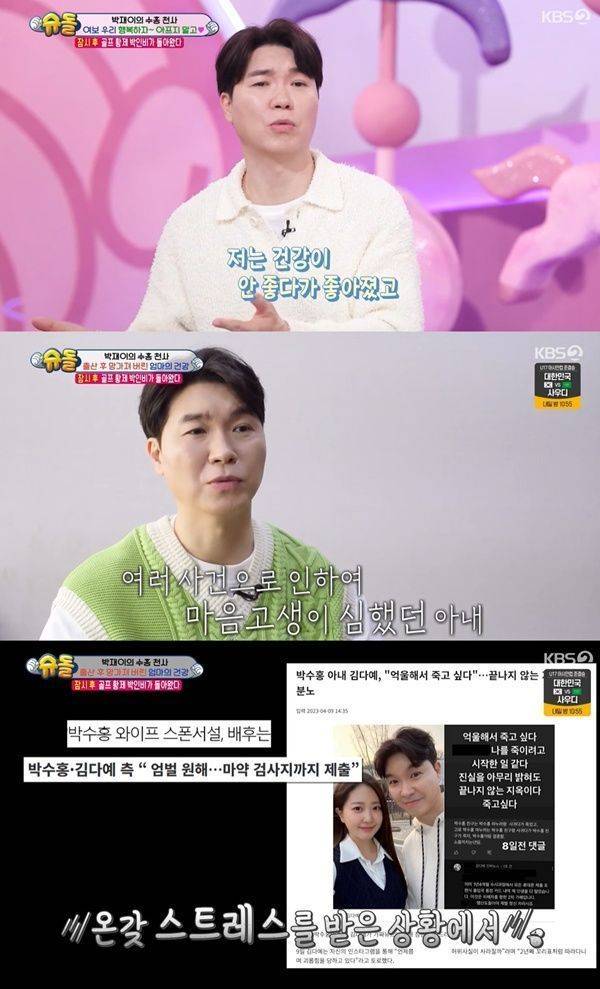 그럼에도 박수홍은 자신을 탓하며 "아내가 이전에 여러가지 사건, 마음 고생하는 일이 많았다. 나보다 더 고생했다. 시험관도 얼마나 힘든지. 마음이 아프다"라고 마음 아파했다.