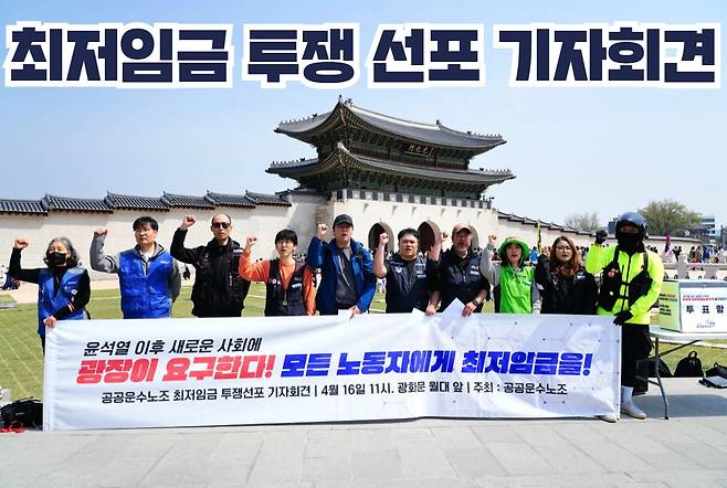 | ▲ 공공운수노조는 지난 16일 오전11시 광화문 월대 앞에서 '최저임금 투쟁 선포 기자회견'을 열고 2026년 최저임금 결정을 앞둔 투쟁 계획과 설문조사(3895명 참여) 결과를 발표했다. |