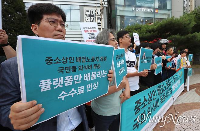 | ▲ 공공운수노조 라이더유니온 등의 주최로 2024년 7월 15일 오전 서울 송파구 우아한형제들 본사 앞에서 "자영업자, 배달노동자 다 죽이고 국민 외식비 폭등시키는 배민 OUT" 배달의민족의 일방적인 수수료 인상 규탄 기자회견이 열리고 있다. |